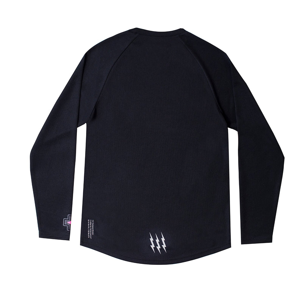 Every rider knows that looking dope makes you shred harder and faster! This black long sleeve jersey is constructed from proprietary, breathable mesh fabric with moisture-wicking abilities to keep you cool, dry, and comfortable. Our fabric was engineered to have just the right amount of stretch to keep things loose, but also in place. It features an ergonomic dropped tail too, ensuring the perfect on-bike fit.