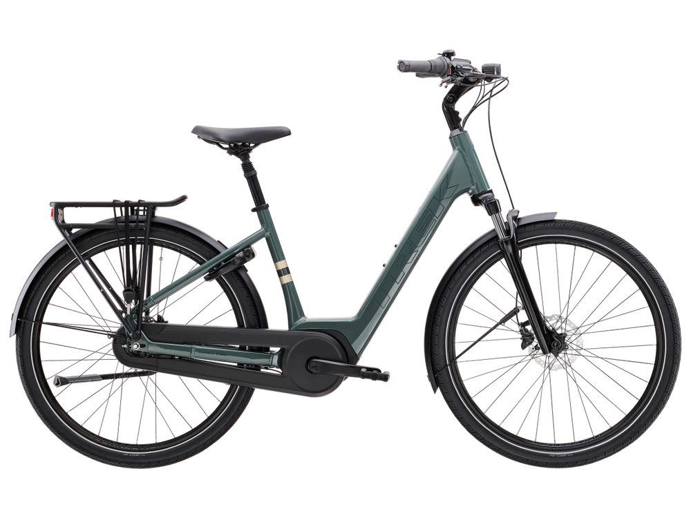 A lightweight lowstep Alpha Smooth Aluminium frame with internal cable routing, a Bosch Active Line Plus (250 W, 50 Nm) motor for speeds up to 20 mph (25 km/h), a 400 Wh CompactTube battery and a Purion 200 controller. Plus, a low-maintenance Shimano Nexus 7-speed internal drivetrain, a suspension seat post, suspension fork with integrated light, powerful hydraulic disc brakes, rear light, a MIK rear and side rack, mudguards, ergonomic grips and a comfy Bontrager saddle.