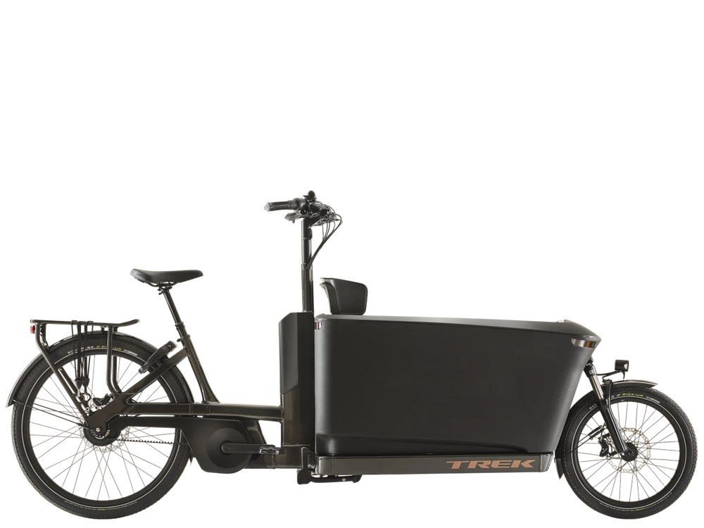A sturdy aluminium frame with a configurable front box with bench and two child seats. A Bosch Performance Line Cargo smart system motor (250 W, 85 Nm) for support up to (20 mph (25 km/h in Europe) and 750 Wh battery. A smartphone controller with wireless charging. A low-maintenance Gates CDX belt drive with a CVT hub for seamless shifting. A suspension fork, 4-piston hydraulic brakes, an adjustable dropper seat post, MIK HD rear rack and a stable kickstand, and Bosch BCM for added anti-theft protection.