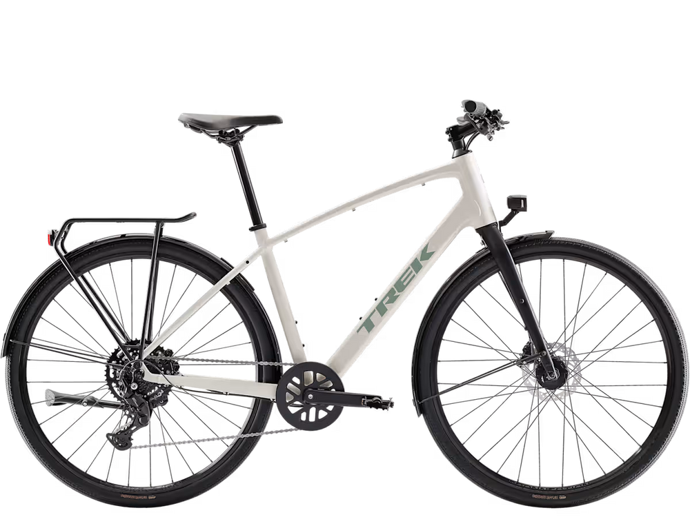 The FX Sport AL Equipped is a capable and confident hybrid bike that's fun to ride from roads to rail trails and beyond. It has a light frame, a sturdy drivetrain and loads of ride-ready accessories like a rear rack and lights. Wide wheels and lofty tyres soak up bumps and rough terrain for a comfortable, confident ride on the road, light gravel trails, bike paths and more.