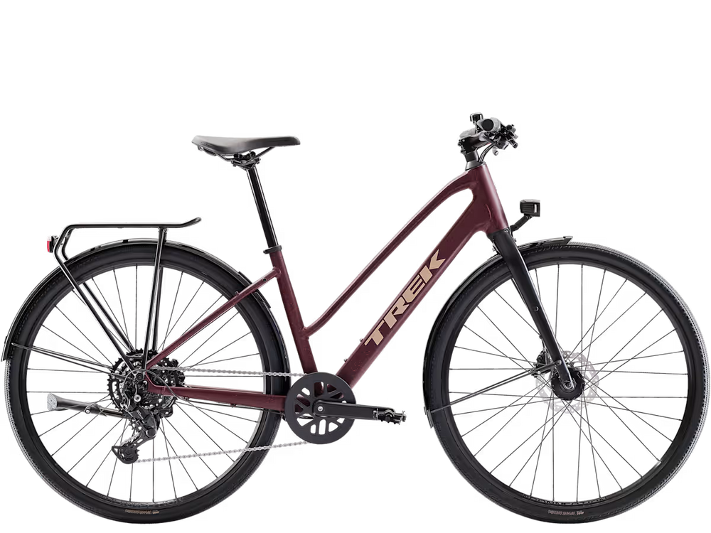 The FX Sport AL Equipped Midstep is a capable go-anywhere hybrid bike that's fun to ride on a variety of surfaces. It has a lightweight midstep frame, a sturdy drivetrain and loads of ride-ready accessories like a rear rack and lights. Its wide wheels and tyres soak up bumps and rough-terrain for a comfortable, confident ride on the road, light gravel trails, bike paths and more.