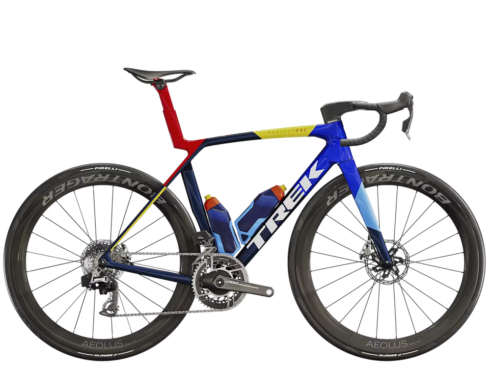 An insanely light frame made of our highest-level 900 Series OCLV Carbon with aero tubing, IsoFlow comfort technology and RSL Aero Bottles and Cages that save watts. SRAM's latest RED AXS E1 ultra-light drivetrain and power meter for training with data. A universal derailleur hanger so you can get a replacement from anywhere. Plus, it's topped off with Bontrager Aeolus RSL 51 tubeless carbon wheels and a Trek Aero RSL one-piece bar/stem.