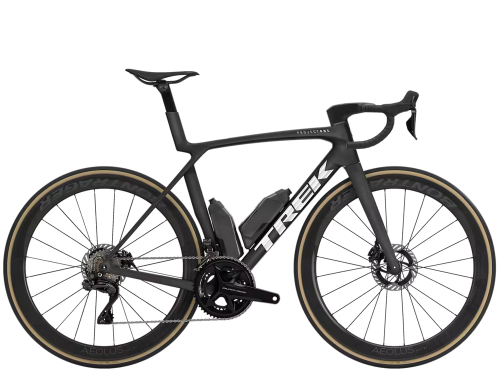 An insanely light frame made of our highest-level 900 Series OCLV Carbon with aero tubing and IsoFlow comfort technology, and RSL Aero Bottles and Cages that save watts. Shimano's top road group set – Dura-Ace Di2, for lightning-fast shifts that you can customise. A universal derailleur hanger so you can get a replacement from anywhere. Plus, it's topped off with Bontrager Aeolus RSL 51 tubeless carbon wheels and a Trek Aero RSL one-piece bar/stem.