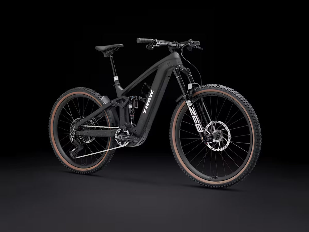 An OCLV Mountain Carbon frame with Bosch Performance CX system (85 Nm, 250 W) and a massive 800 Wh RIB 2.0 removable integrated battery. A 160 mm RockShox ZEB Ultimate fork with DebonAir spring and Charger 3 RC2 damper, and RockShox Super Deluxe rear shock. Tubeless Ready Bontrager Line Pro 30 carbon wheels, SRAM's X0 AXS wireless electronic transmission that shifts clean even under load, plus SRAM Maven hydraulic disc brakes for stopping on a dime and a RockShox Reverb AXS dropper post.