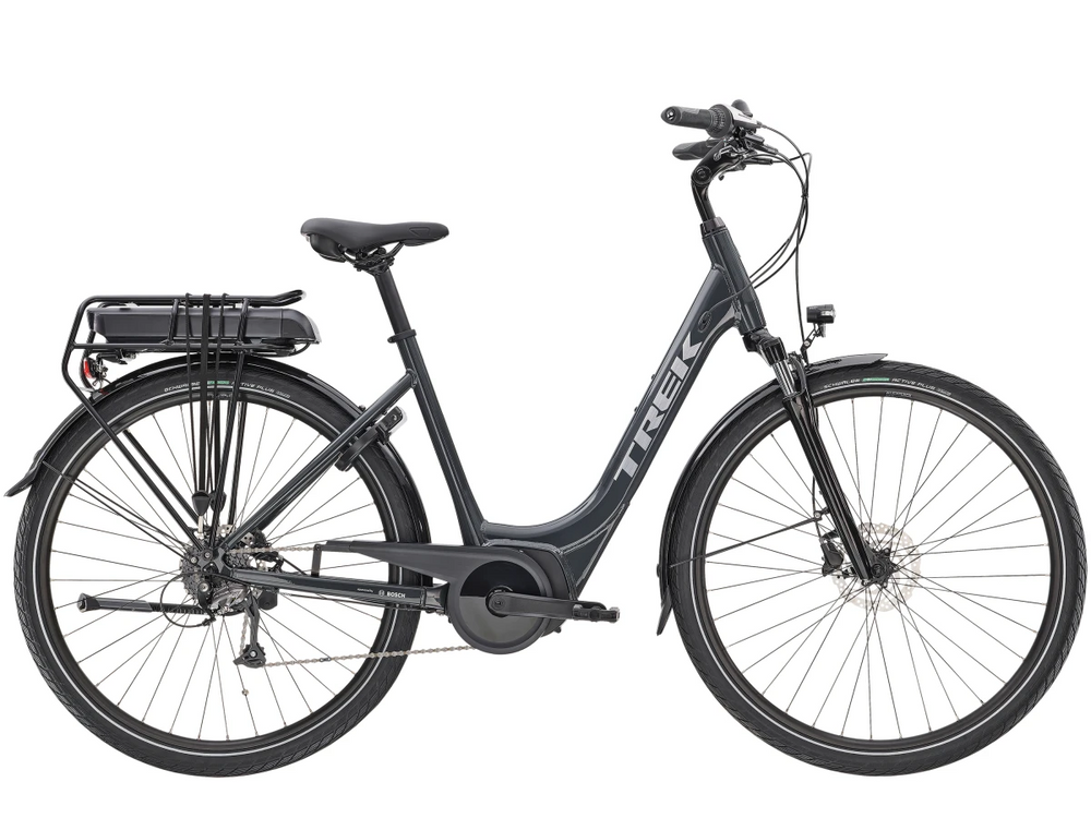 A lightweight aluminium frame with lowstep geometry, 8-speed Shimano drivetrain and a Bosch Active Line (250 W, 40 Nm) motor capable of sustaining speeds up to 20 mph (25 km/h in Europe), a Purion controller and your choice of a 300 Wh, 400 Wh or 500 Wh battery. Plus, a suspension fork, hydraulic disc brakes, an adjustable, Blendr-compatible stem, extra-wide 50c tyres for stability and traction, ergonomic grips, mudguards, lights, an MIK-compatible rear rack and a lock.