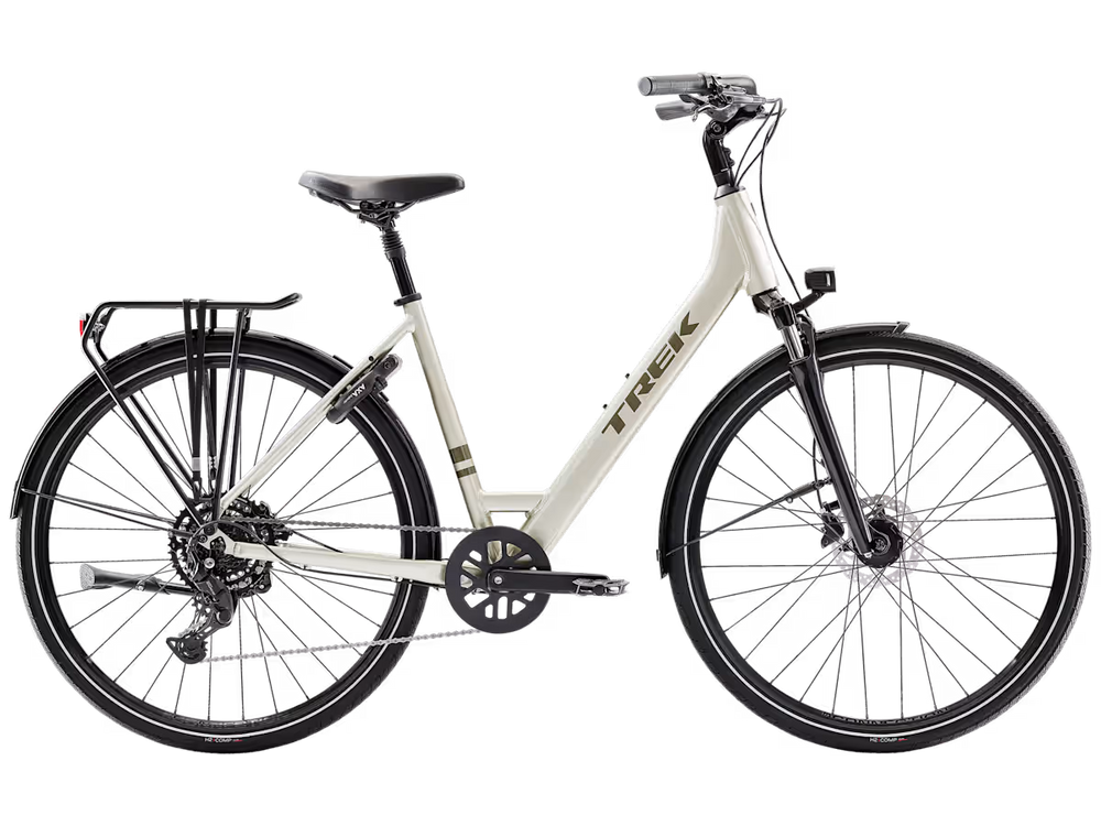 A lightweight aluminium frame with a lowstep design, a 9-speed Shimano CUES U4000 drivetrain for durable shifting, powerful hydraulic disc brakes, an adjustable stem, a padded saddle, ergonomic grips, reflective and wide 40c tes for extra stability, a road-smoothing suspension fork and seat post, front and rear lights powered by a 3.0-watt Dynamo hub and geometry that keeps you in a comfortable and upright riding posture. Plus, it comes equipped with everything you need to ride, like mudguards, lights, a kickstand, a lock and a rear MIK rack.